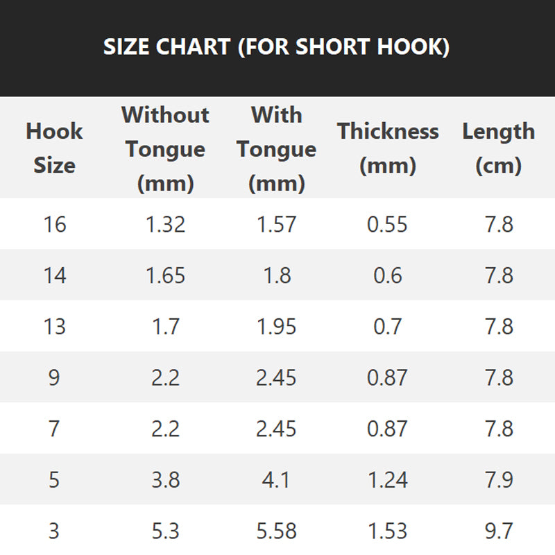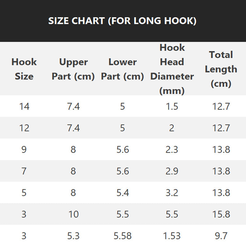 Longueur (pour crochet à double extrémité) : 3,6 cm (12 aiguilles), 4,3 cm (14 aiguilles)