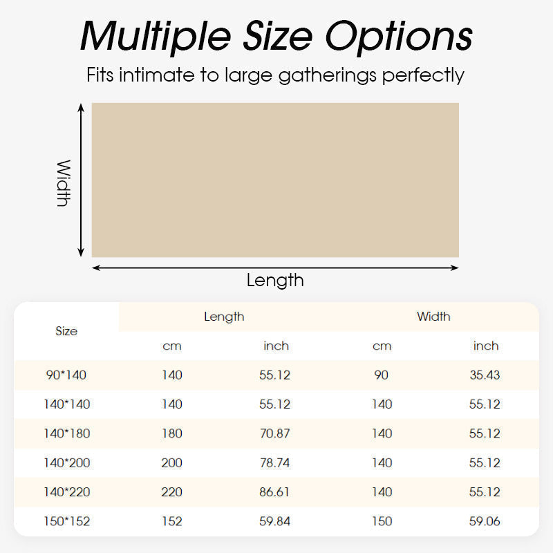 Tailles : 90 × 140 cm, 140 × 140 cm, 140 × 180 cm, 140 × 200 cm, 140 × 220 cm, 150 × 152 cm (nappe ronde)