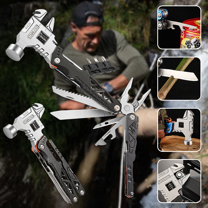 OUTIL MULTIFONCTION : Cet outil polyvalent comprend une clé à molette, un marteau, un arrache-clou, des tournevis, un coupe-fil, une pince ordinaire, une pince à bec effilé, une tige de silex, un sifflet de sécurité, un ouvre-bouteille, un ouvre-boîte, un enfileur, un couteau, une scie et plus encore – tout ce dont vous avez besoin dans un seul appareil compact.