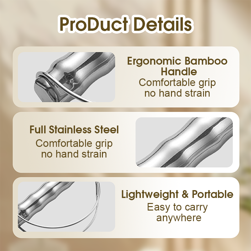 POIGNÉE ERGONOMIQUE EN BAMBOU: Conçue avec une prise texturée en bambou améliorée qui s'adapte naturellement à la main, réduisant la pression et éliminant la fatigue des doigts. Assure une prise sûre et antidérapante lors du transport de sacs d'épicerie lourds, rendant le levage fluide et confortable même sous la charge.