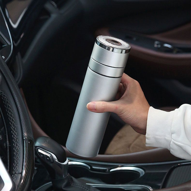 Les personnes qui conduisent souvent doivent absolument se procurer cette tasse isotherme indispensable. Elle est dotée d'un système à bouton-poussoir qui permet d'ouvrir le couvercle en une seconde sans avoir à le tourner à deux mains, et de le refermer en appuyant doucement dessus, ce qui rend son utilisation à une main plus sûre.