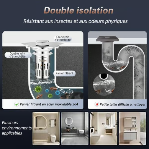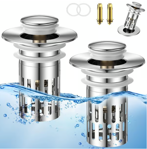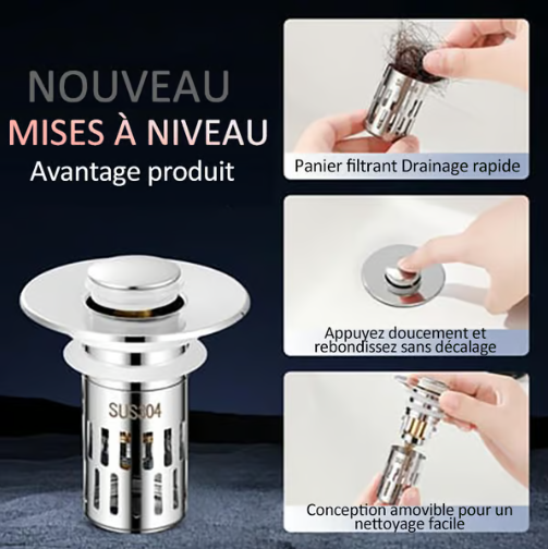Contrairement à un bouchon de drainage à bouton poussoir classique, ce bouchon de drain est équipé d'un strainer à panier anti-bouchage à l'intérieur qui collecte soigneusement les cheveux et empêche le drain de se boucher. Aucun bijou, bague, saleté ni autre objet ne pourra entrer dans le tuyau de drainage.