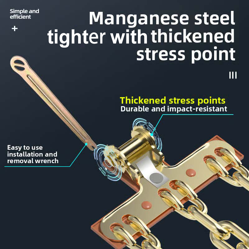 DURABLE & WEAR-RESISTANT-MATERIAL - Crafted from thickened manganese steel, these tire chains are engineered for enduring harsh winter environments. The material resists low temperatures and abrasive road conditions, ensuring long-term durability and consistent performance. This robust construction withstands significant wear from various terrains, extending the lifespan of the chains across multiple seasons of use.